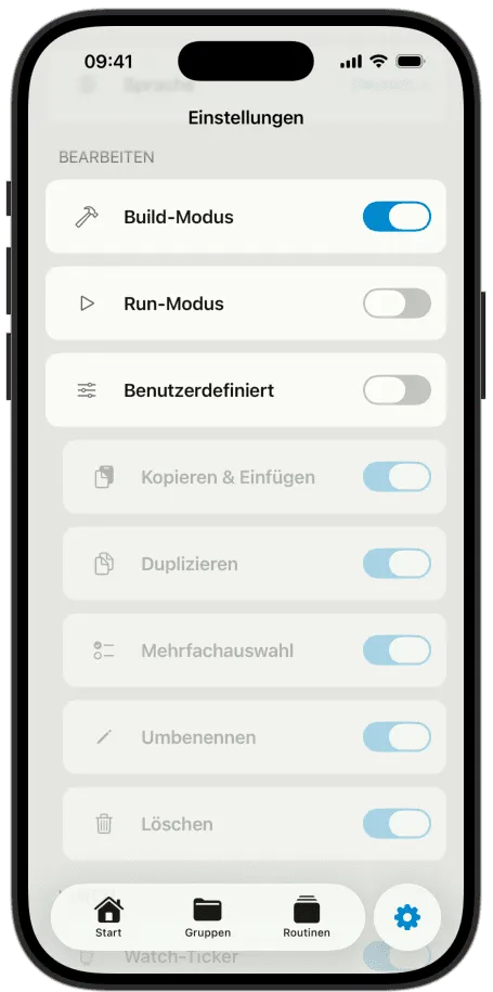 Build-Modus schaltet alles ein — sämtliche Werkzeuge zum Erstellen und Organisieren von Routinen, Gewohnheiten und Gruppen. Hier richtest du alles ein.