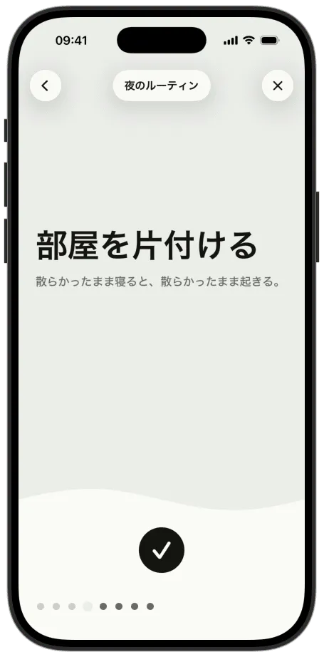 ルーティンをつくります。朝のルーティン、ジム、仕事のプロセス、順番に進めると効果的なものなら何でも。それを実行します。一度に一つのステップ、画面にはそれだけ。終わったら、終わりです。