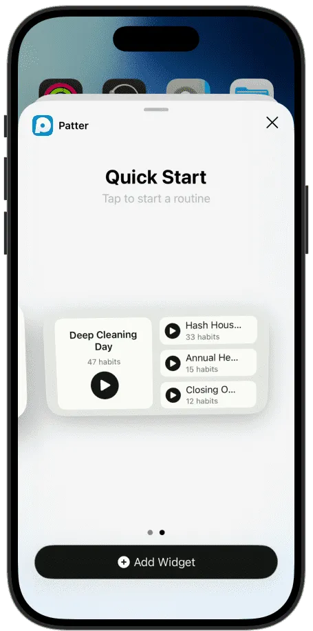 Patter runs on your iPhone and Apple Watch. It sits on your home screen as a widget, your lock screen as a shortcut, and in your Dynamic Island while a session is running.