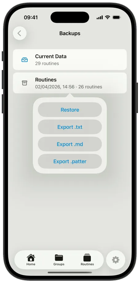 Patter stores everything on your device. Routines, habits, backups — all local. No account to create, no email to hand over, no analytics running in the background.