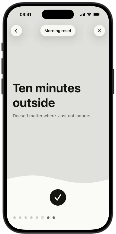 You build a routine — morning, gym, work process, anything that goes better in order. You run it. One step at a time, nothing else on screen. When you're done, you're done.