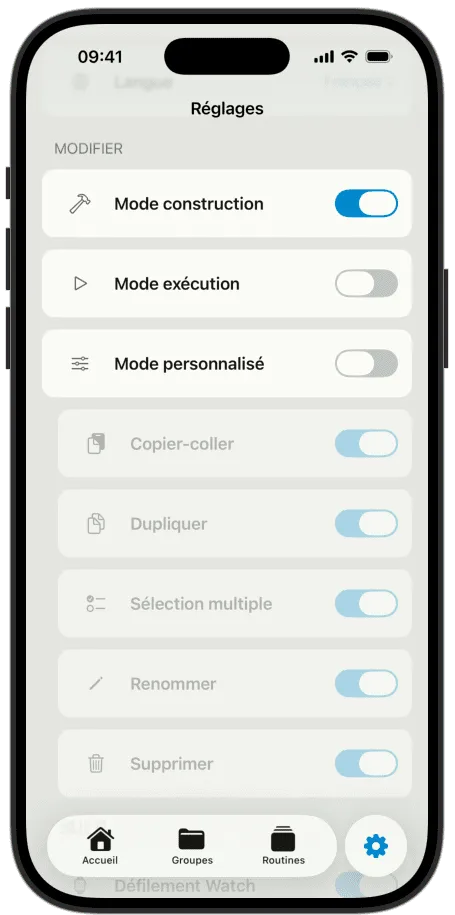 Mode construction active tout — tous les outils pour créer et organiser routines, habitudes et groupes. C'est ici que vous mettez tout en place.