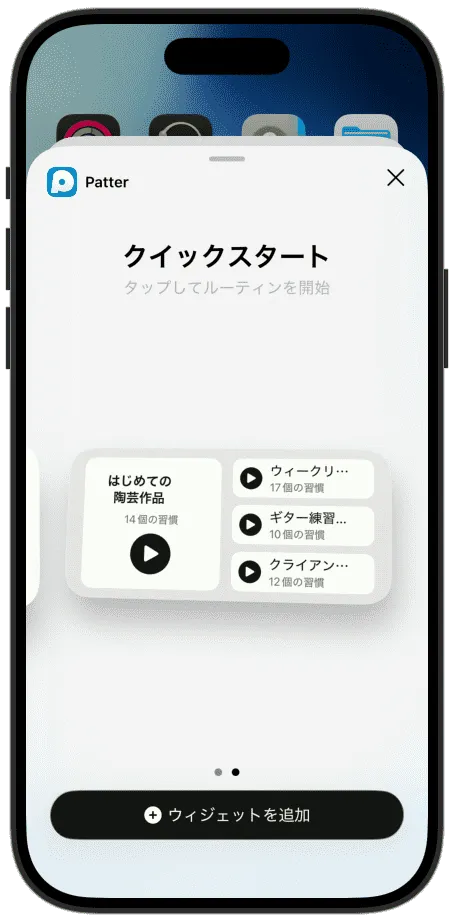 PatterはiPhoneとApple Watchで動作します。ホーム画面にウィジェットとして、ロック画面にショートカットとして、セッション中はダイナミックアイランドに表示されます。