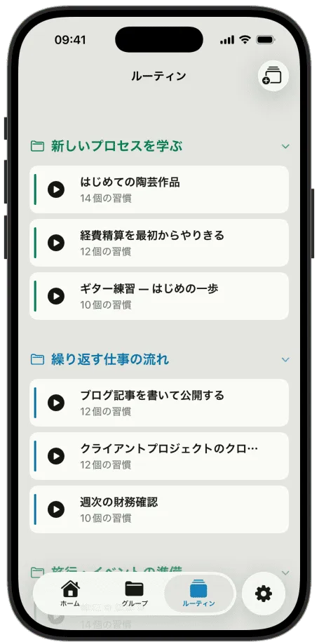 ルーティンをつくります。朝、夜、ジム、好きな名前をつけてください。習慣を追加します。それぞれに名前と、任意のメモをつけます。準備ができたら、実行します。