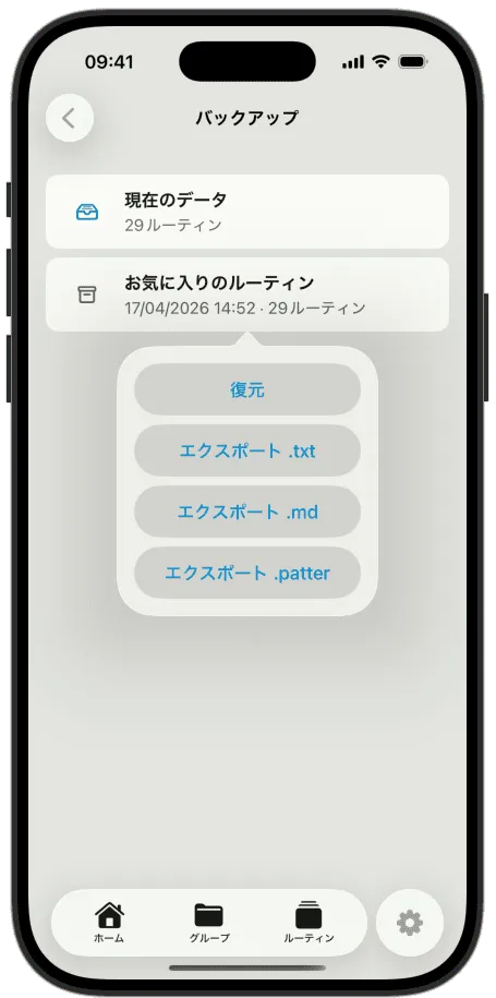 名前をつけたバックアップを保存して切り替えることができます。仕事用に一つ、自宅用に一つ、切り替えは三タップ。テキストファイルからインポート、または.txt、.md、.patter形式でエクスポートできます。