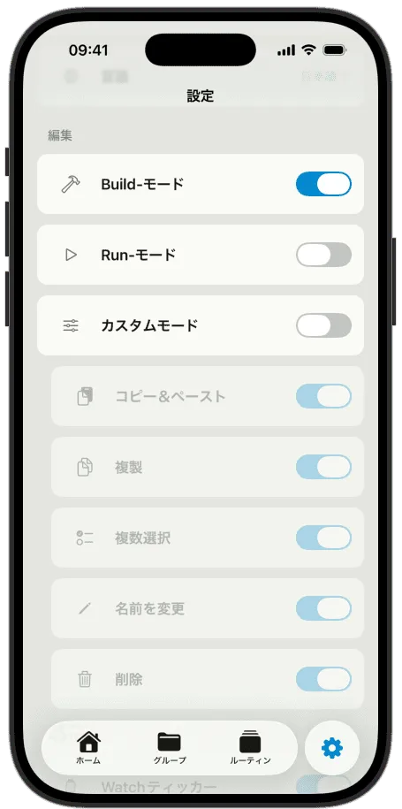 Build-モードはすべてをオンにします。ルーティン、習慣、グループの作成・整理に必要なツールがすべて表示されます。ここでセットアップを行います。