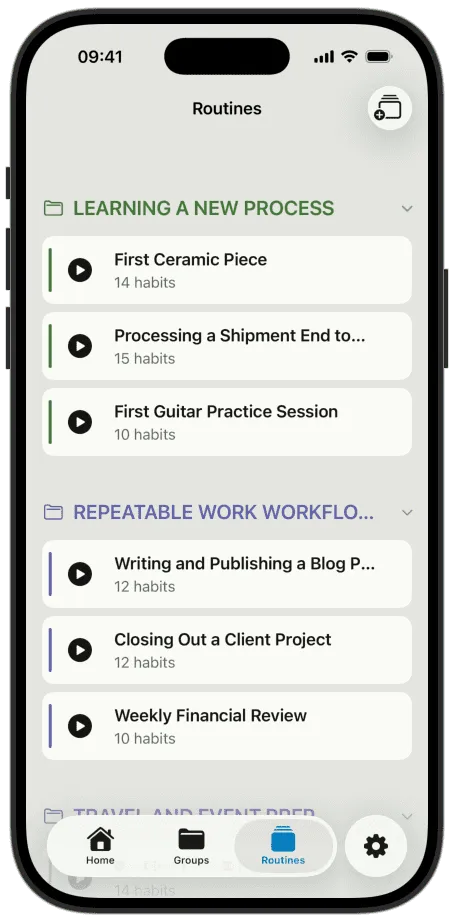 You create a routine — morning, evening, gym, whatever you call it. Add habits. Each one gets a name and an optional note. When you're ready, you run it.
